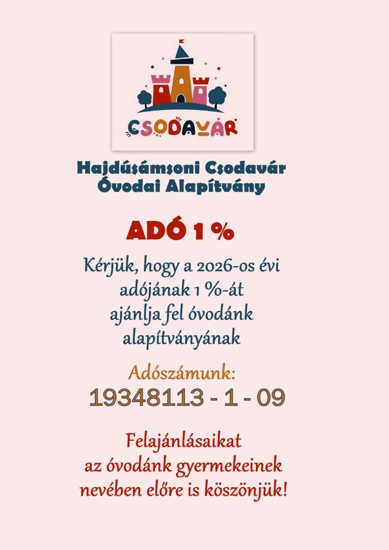 A jelenlegi jogszabályok értelmében alapítványunk 2025. januárjától már fogadhatja az adóbevallások során felajánlható 1%-ot. A szülők által tavaly és tavalyelőtt felajánlott összegekből a játszóudvarra vásároltunk egy kétüléses hintát, egy kombinált mászókát, valamint egy kötélpiramist. Köszönjük, ha a későbbiekben is támogattok bennünket!