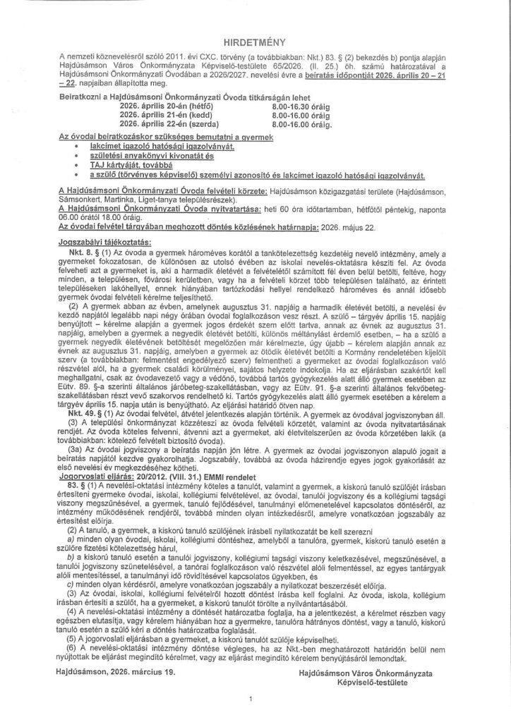 A Hajdúsámsoni Önkormányzati Óvoda felvételi körzete: Hajdúsámson közigazgatási területe(Hajdúsámson, Sámsonkert, Martinka, Liget-tanya településrészek).