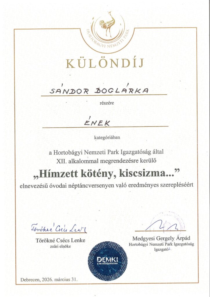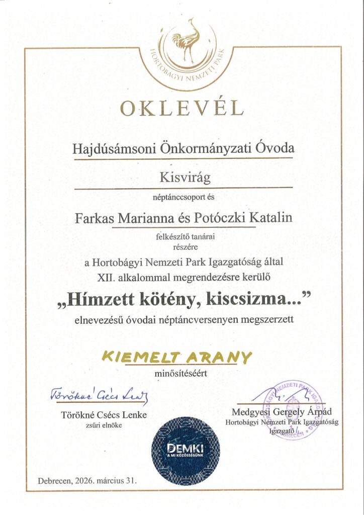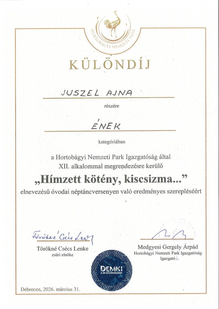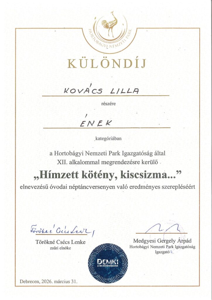 2022-23-24 tavaszán a Hortobágyi Nemzeti Park Igazgatósága által meghirdetett „Hímzett kötény, kiscsizma” elnevezésű néptáncversenyen arany minősítést, míg 2025 áprilisában ezüst minősítést kaptunk.